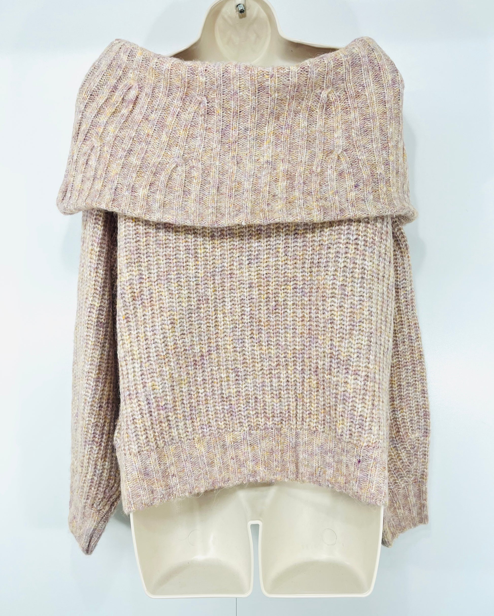 Beautiful and sexy wide collar jumper in boho style. Can be worn off the shoulder or as wide boat neck. Relaxed fit. Short length. Soft mid chunky knit. Colour is mix of pinks, rustic yellow, light purple, cream and white. Colours may look a bit different in different light settings.