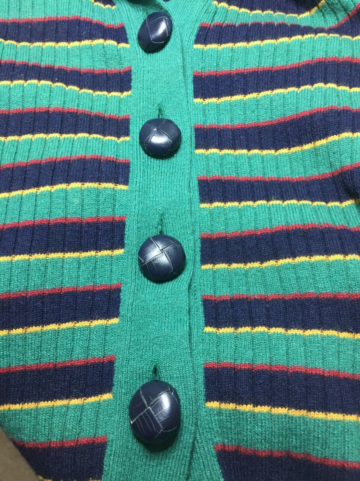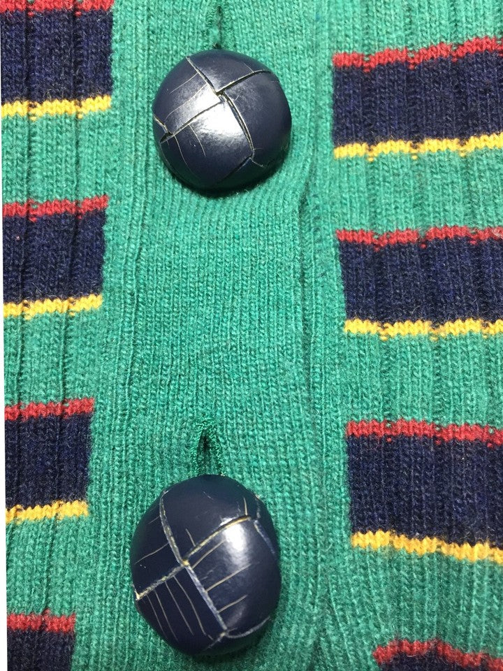 Beautiful and trendy v-neck cardigan. Relaxed fit. Distressed vintage style buttons fastening. Extra long sleeve. Soft thin knit. Unlined. Colours are soft mid green, navy, dark red and mid yellow. Colours may look a bit different in different light settings.