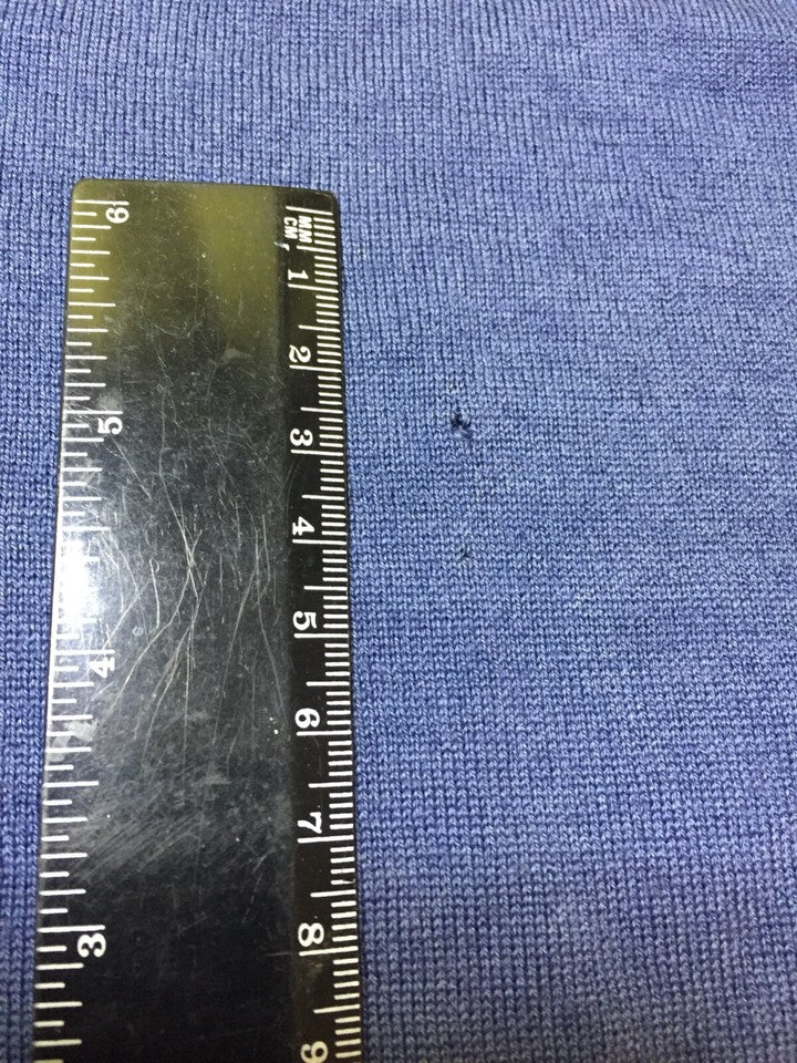 Elegant and trendy v-neck jumper. Soft silky thin knit. Unlined. Colour is sort of slightly dusky mid blue; hem, cuffs & neck trim in slightly lighter shade of blue. Colours may look a bit different in different light settings.