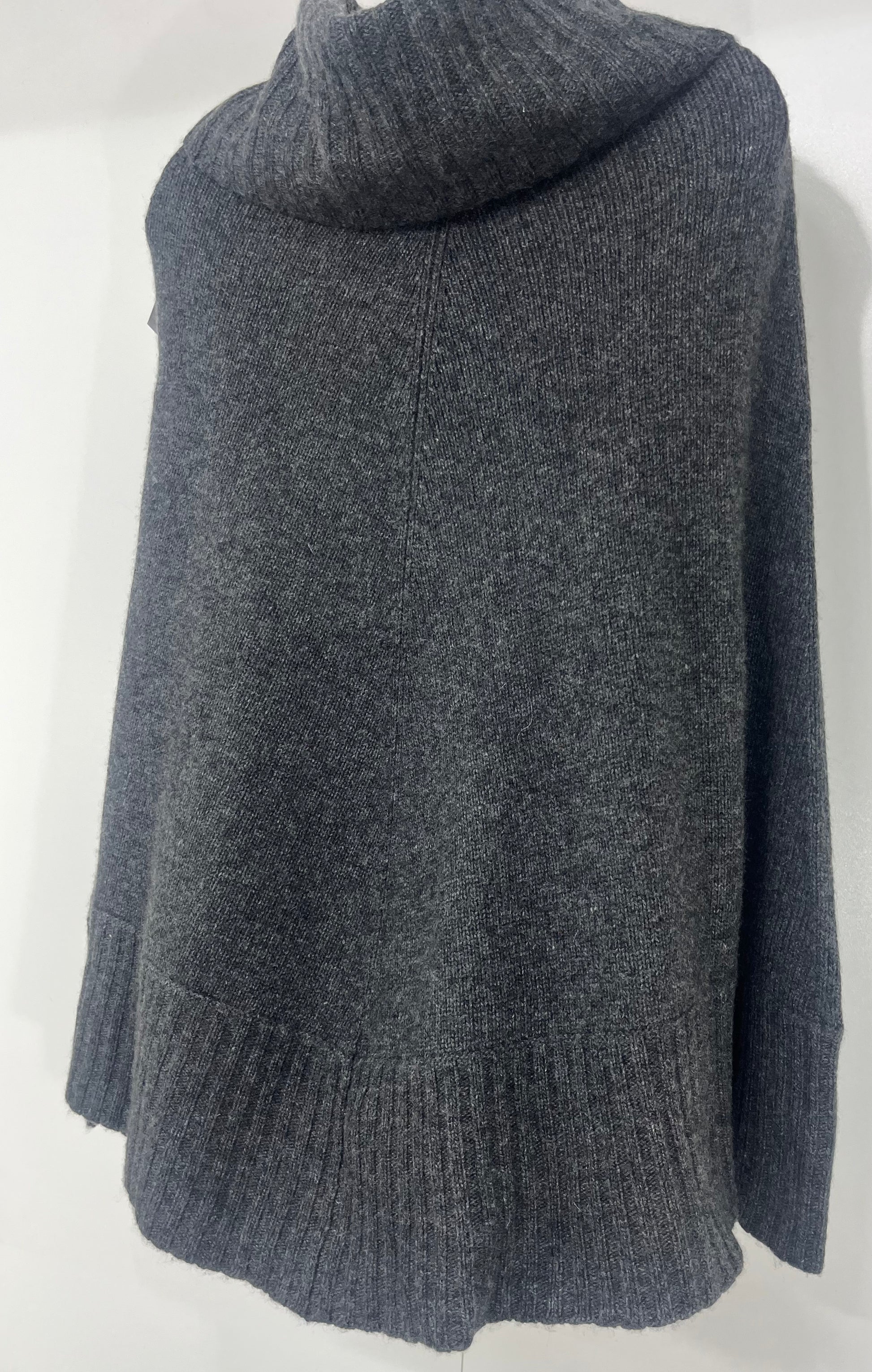 Beautiful wide roll neck poncho jumper. Style "Maye". Great boho look. Pull over. Sort of bell shape when laid flat, see last pic. There are no sleeve seams, just two short seams along hem line at sides, 10 cm in from side seam, not sure why, possibly to create a cuff to put your hand through or just design detail. Soft mid thickness knit. Colour is dark grey/charcoal. Colours may look a bit different in different light settings.