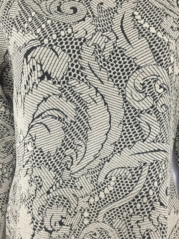 Absolutely stunning below knee/midi bodycon/shift dress in classic/retro style. Looks amazing on. Pull over. Unlined. Soft textured jersey, medium thickness, almost like a support strength so holds everything in beautifully. Colours are taupe/dark beige and black. Colours may look a bit different in different light settings.